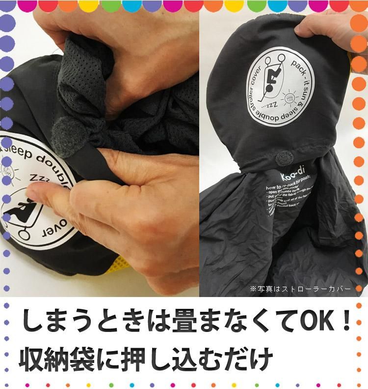 ダークグレーを基調としたスタイリッシュなベビーカーレインカバー。 ![]() 屋内に入る度にレインカバーを脱着するのは大変。 ![]() 透明窓はくるくる巻いて、スナップボタンの付いた紐で留めておくことができます。 ![]() 空気を取り込むためのメッシュ部分は雨の侵入を防ぐために透明シートが付いている安心設計。 ![]() 1.収納袋からレインカバーを取り出します。 ![]() 収納袋は本体と一体型となっているため紛失の心配はありません。 ![]() コンパクトに収納できるので、持ち運ぶのにかさばりません。 ![]() 収納袋からレインカバーをすべて取り出した後、収納袋を裏返してください。 ![]()