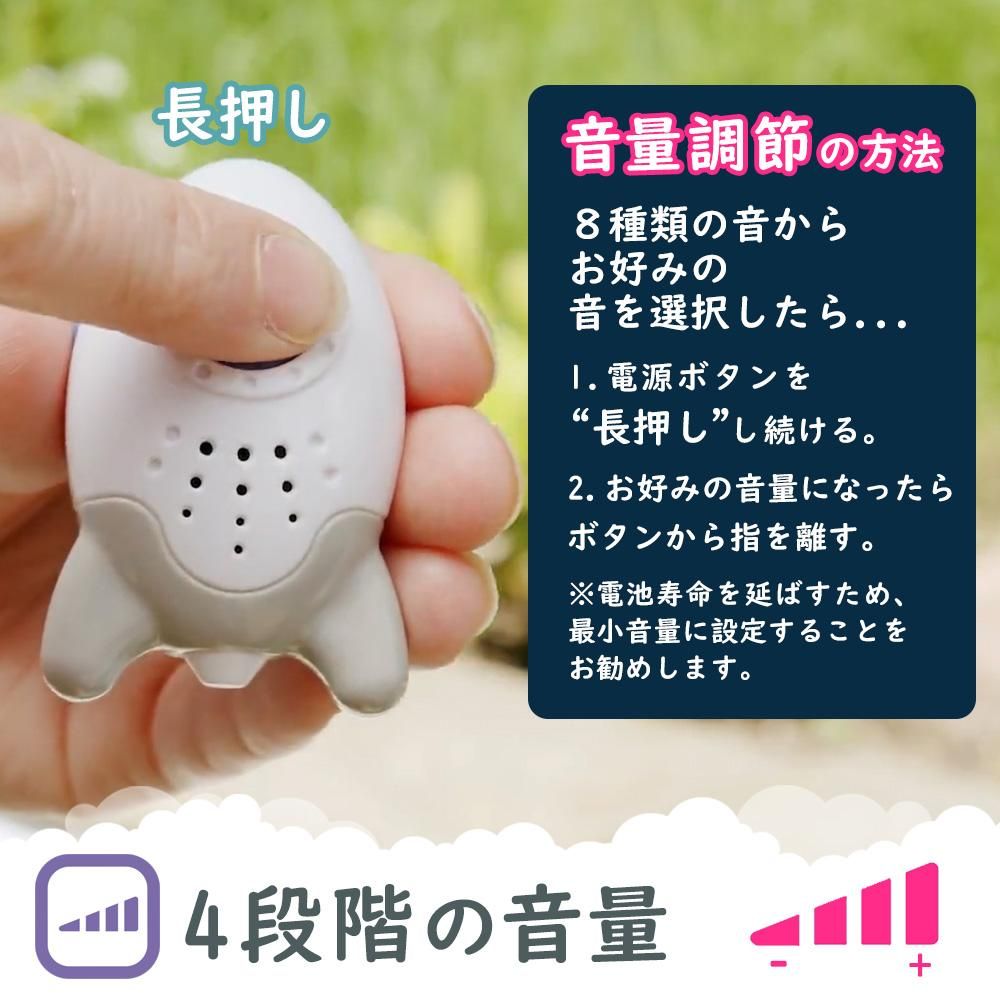 8種類の音の中からお好みの音を選択した後、電源ボタンを長押しし続けると音量の切り替えができます。本体充電後の音量は自動的に最小音量に設定されています。